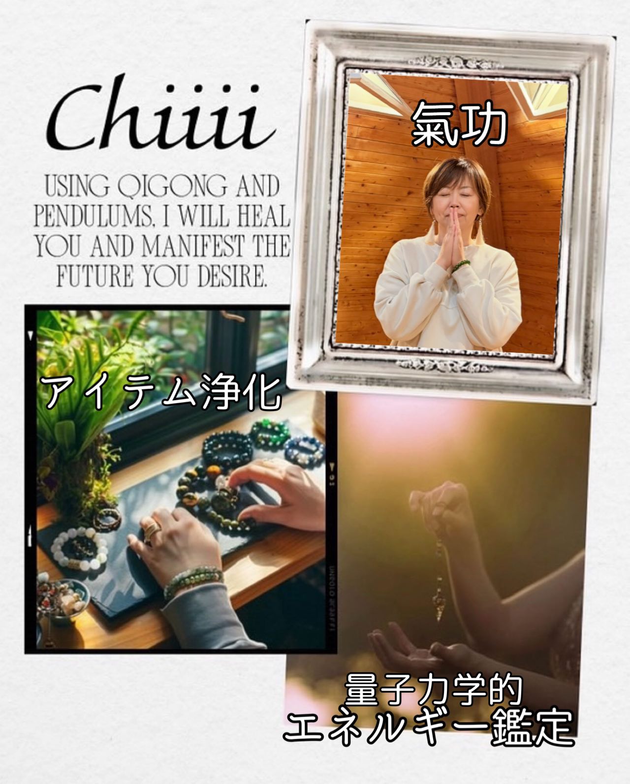 “なりたい私”を現実にし、人生を最速で解放させるサポートをしています。鑑定・氣功・浄化を別々に習得。ペンデュラムを通じ宇宙からエネルギーにアクセスし、DNAレベルで人は"氏名"をキーに本来の魂のもつ使命等を。土地は"住所"で鑑定。相性や選択・悩みを相談の中から降ろし紐解きます。氣功では身体の痛みの取り除き、運氣を召喚します。チャクラや潜在意識や氣の調整をし、不必要な記憶,物に宿る邪氣も浄化します。
