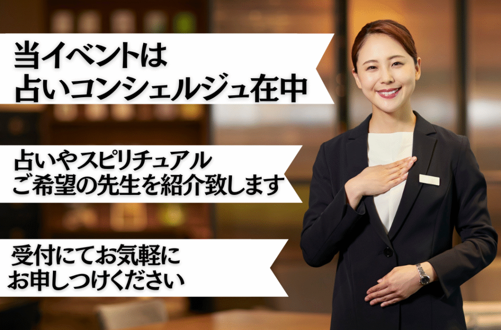 当イベントは占いやスピリチュアル初心者、イベント参加が初めての方でも楽しめるよう、お客様にあった占い師やスピリチュアリストをご紹介するサービスを行っております。