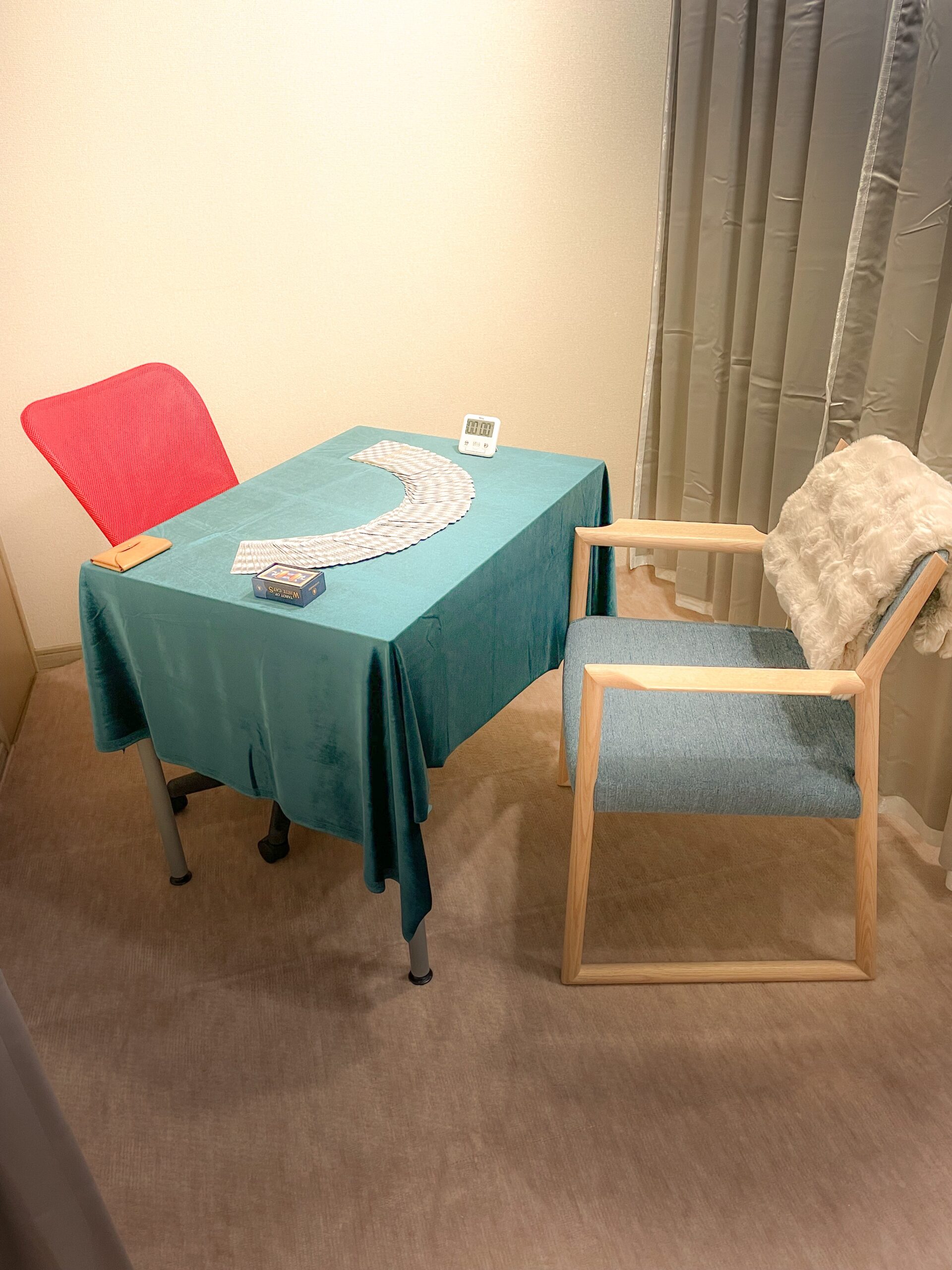 お客様が悩み、今後に向き合えるプライベートな鑑定室。座り心地にこだわり、長時間相談頂いても疲れない飛騨家具の椅子をご用意しています。群馬県高崎産のオーガニックハーブティーを飲みながら、ゆるりとご相談ください。